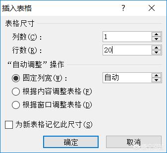 2、 点击表格选项卡,输入一列二十行,如图所示。