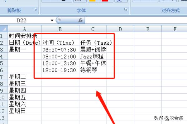 6、第六步:给内容选上边框线再调整表格格式和字体,时间安排表制作好了,根据自己的需要填写时间和任务,如下图所示。