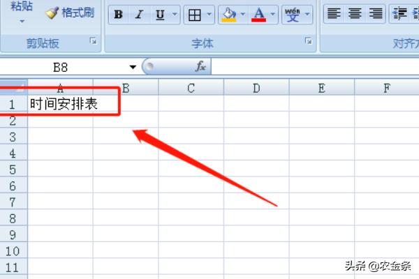 2、第二步:打开Excel表格,填写出标题:时间安排表,如下图所示。