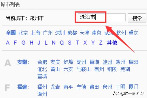 5,在搜索里输入我们所在地的城市名字,如图所示:
