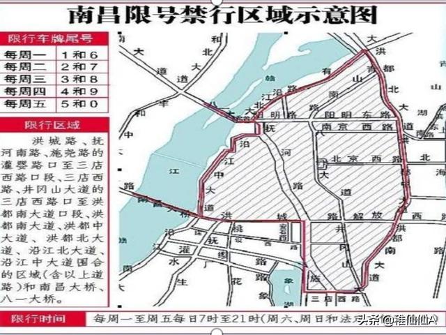 2018年南昌限行限号新规定,南昌限行限号地图?1、限行规则:限行依据机动车车牌尾号为判定依据,每周一限制车牌号尾数为1和6的车辆在限行时间段内进入禁行区域,每周二限制2和7,周三是3和8,周四是4和9,周五是5和0。