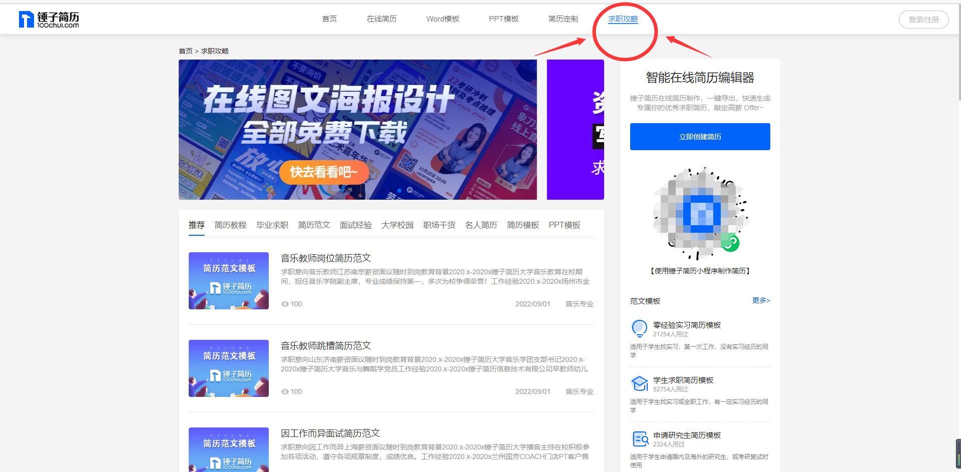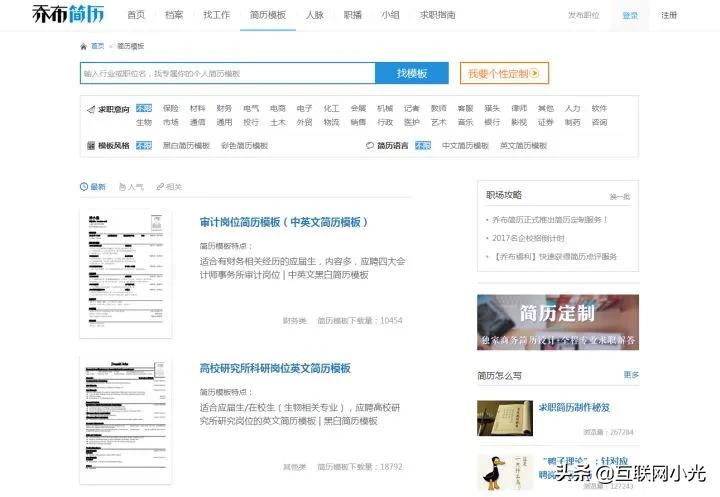站内菜单栏里有“求职攻略”“在线简历”以及“简历定制”都是占了大头的功能,每一个模块都很丰富,相信你一定可以找到你想要的求职方向的简历模板。
