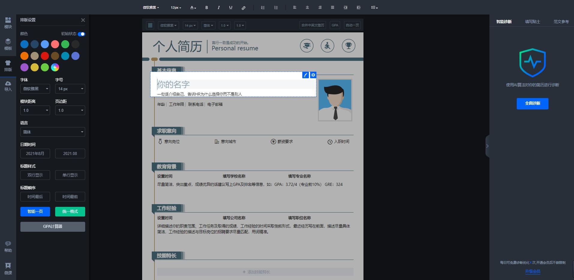 尤其是在线编辑器,支持任意更换模板、主题颜色、智能诊断、自动排版、范文应用等。对于大部分不熟悉专业软件的应届生来说,非常的方便高效实用,也深受企业HR的认可喜爱!